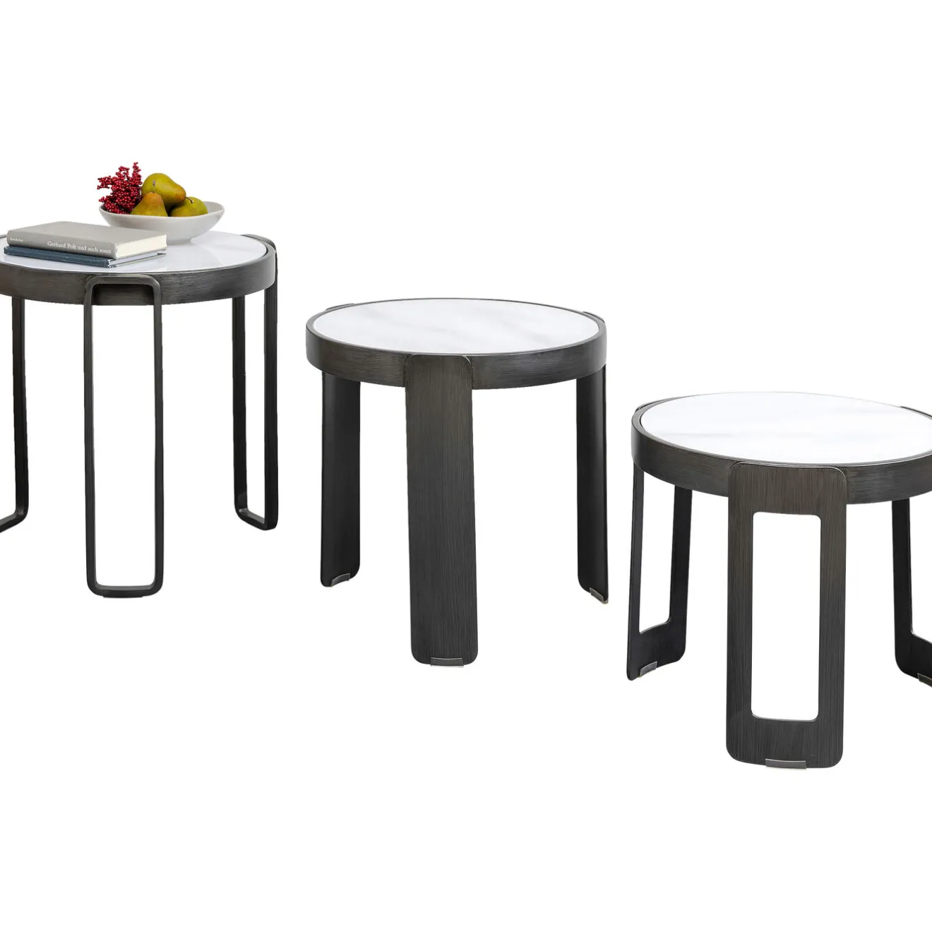 - Set De Trois Tables D’Appoint Extravagantes : Trois Tables Basses Rondes En Noir De Differentes Tailles Et Avec Un Elegant Imprime Marbre En Blanc