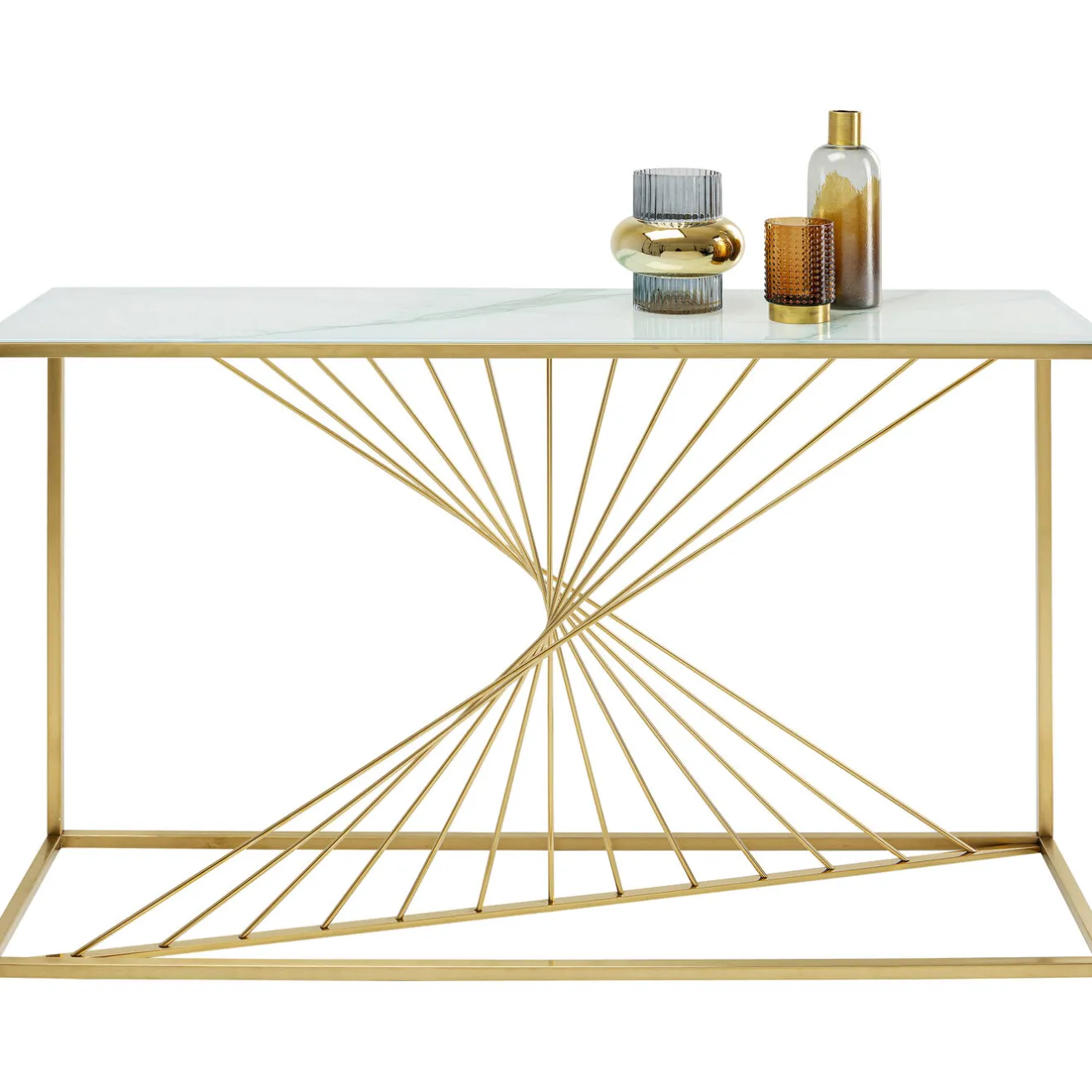 - Gold-Coloured Console Table With An Exclusive Frame And A White-Grey Glass Top In A Marble Look