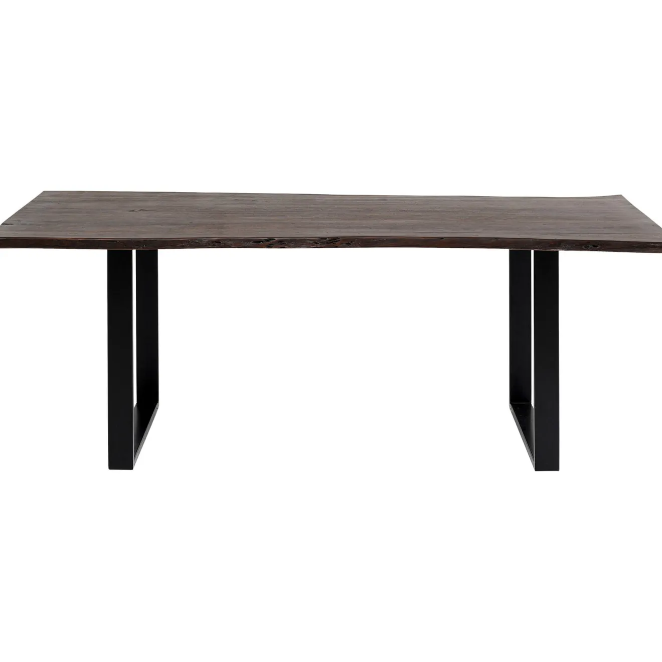 - A Rectangular Dining Table Made Of Real Wood With A Black Steel Frame In A Skid Shape