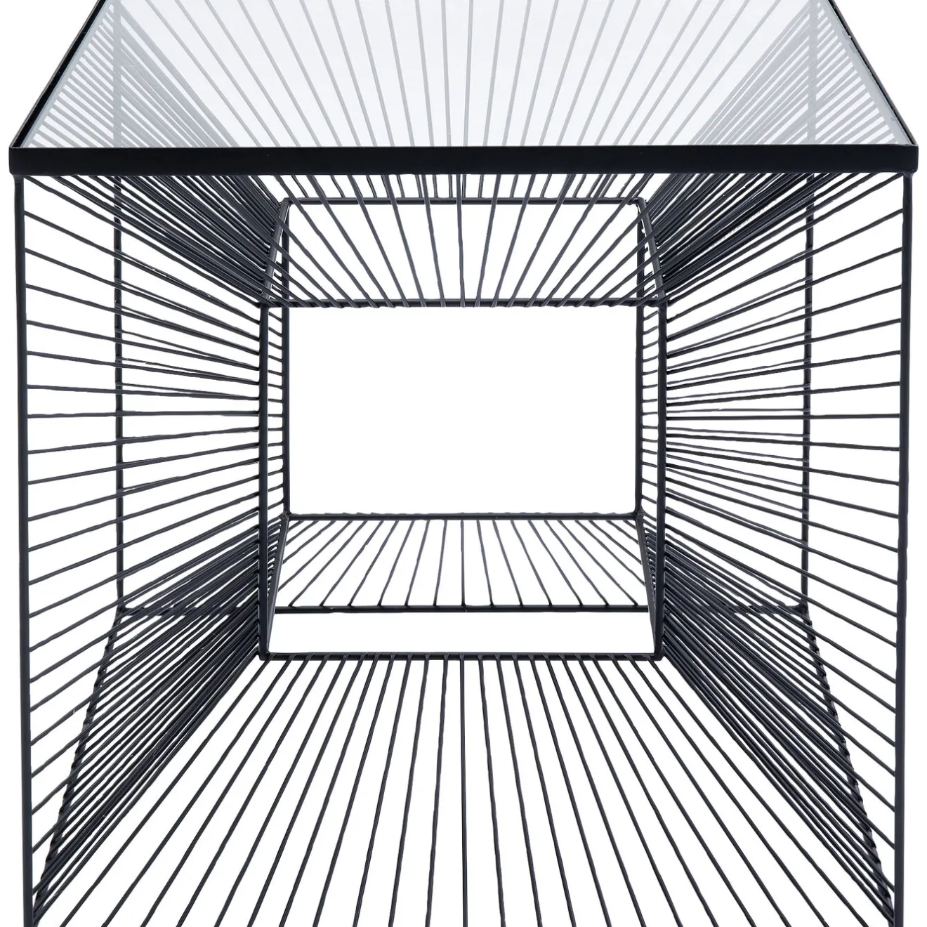 - Black Coffee Table With Clear Glass Table Top,Which Looks Like A Modern Art Object Due To Its Graphic Steel Wire Frame